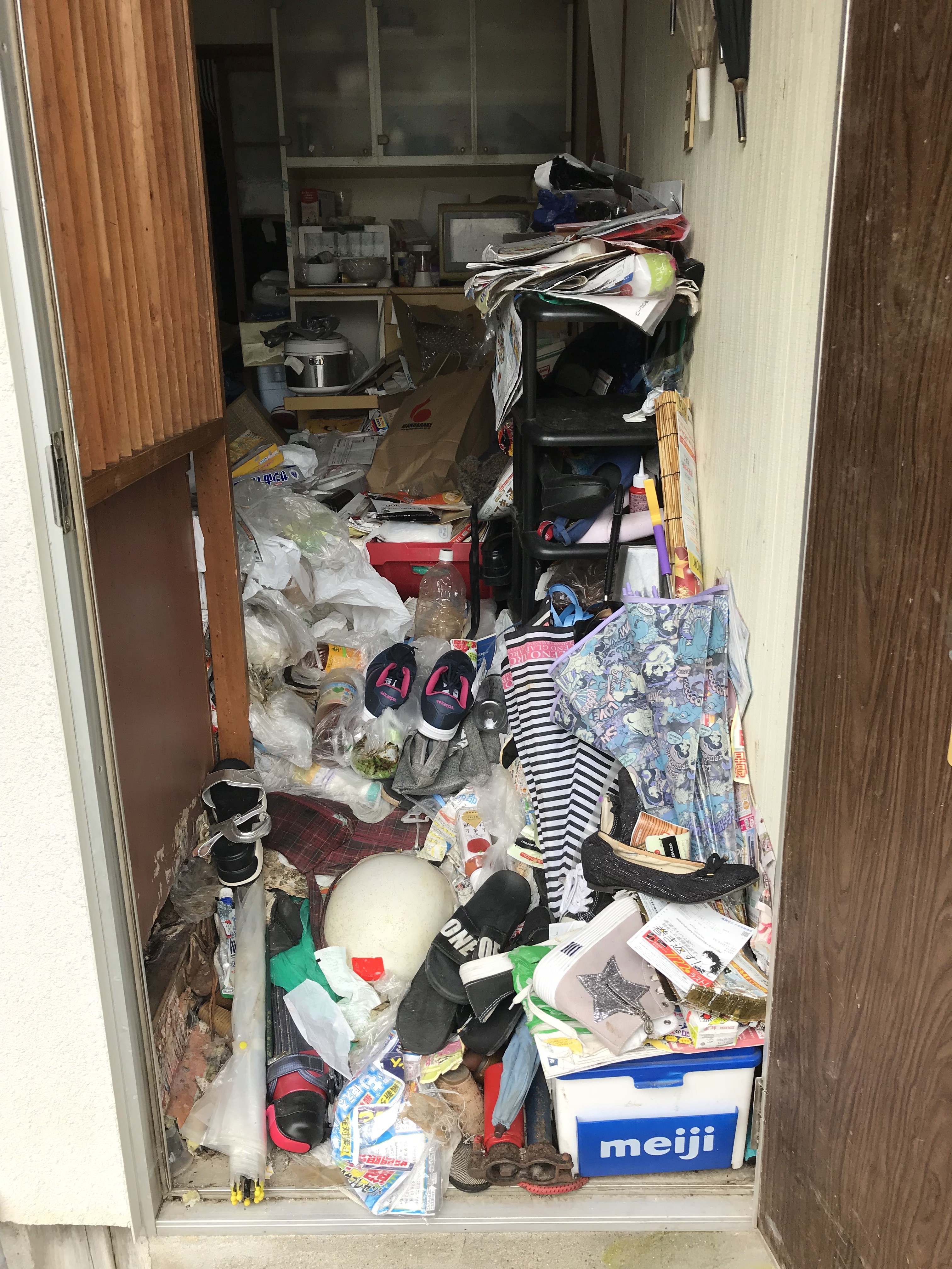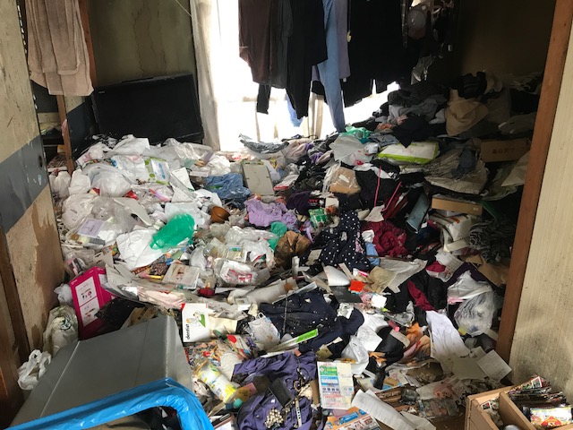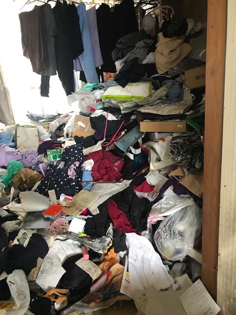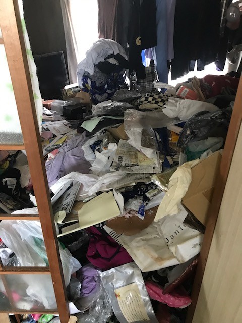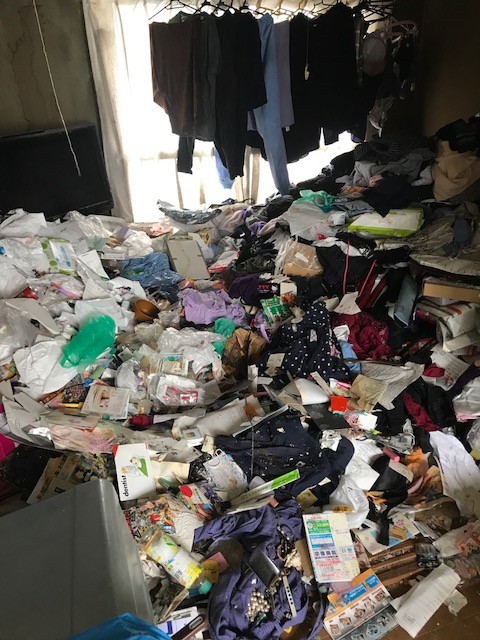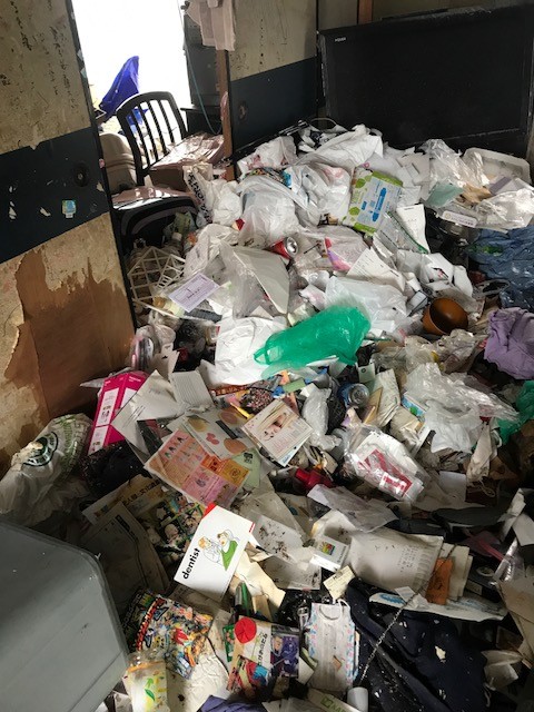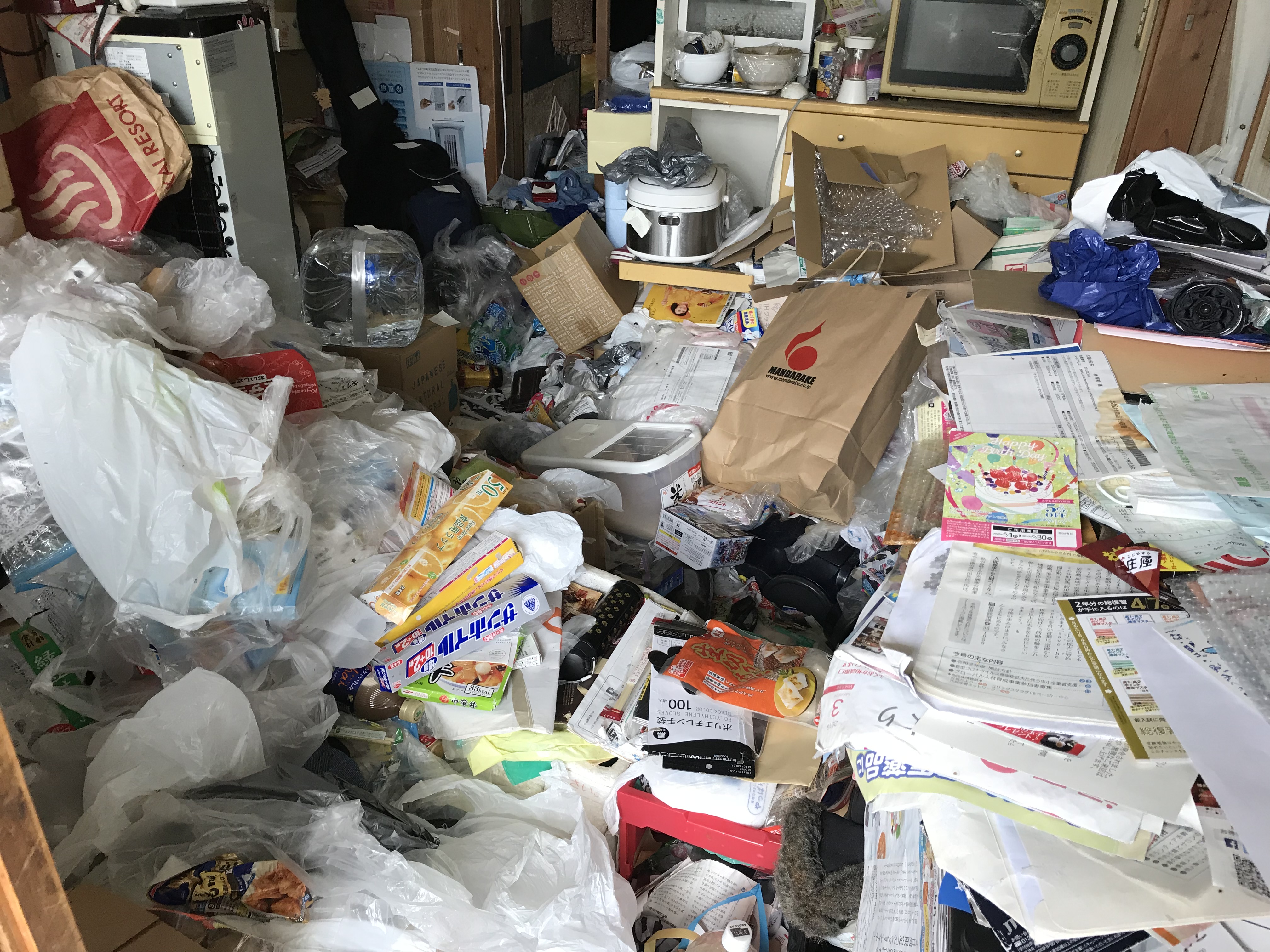大量のゴミ・食品腐敗物・布団・衣類・瓶類・缶類・不燃ゴミetc・食器棚・本棚・ソファー・冷蔵庫・洗濯機・扇風機・ヒーター・炊飯器・デッキ・スピーカー・アンプ・コンポ・ベッドマット・雑誌・CD・靴・傘ほか