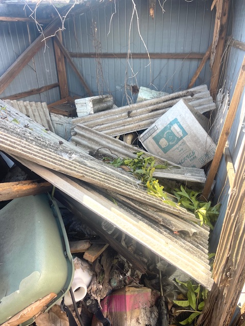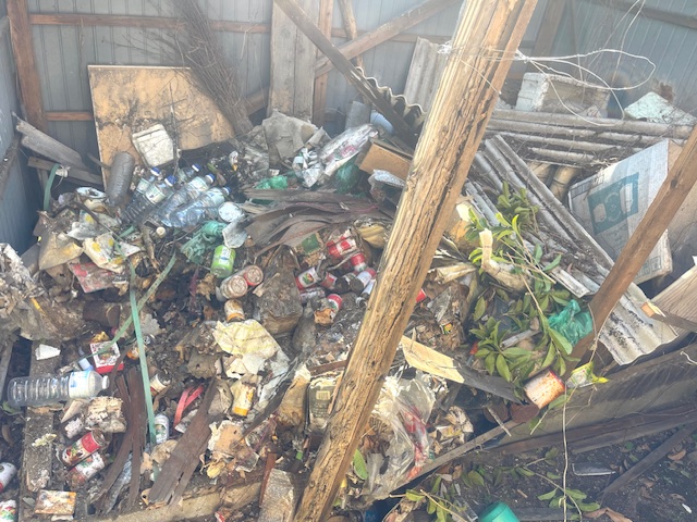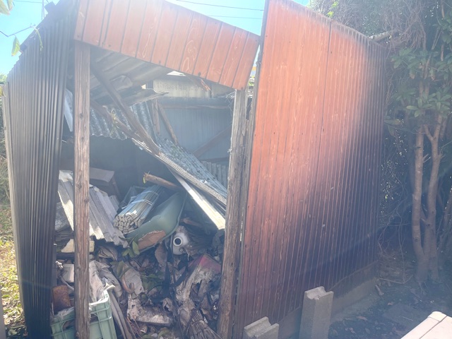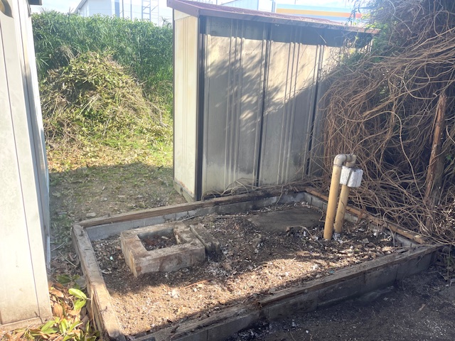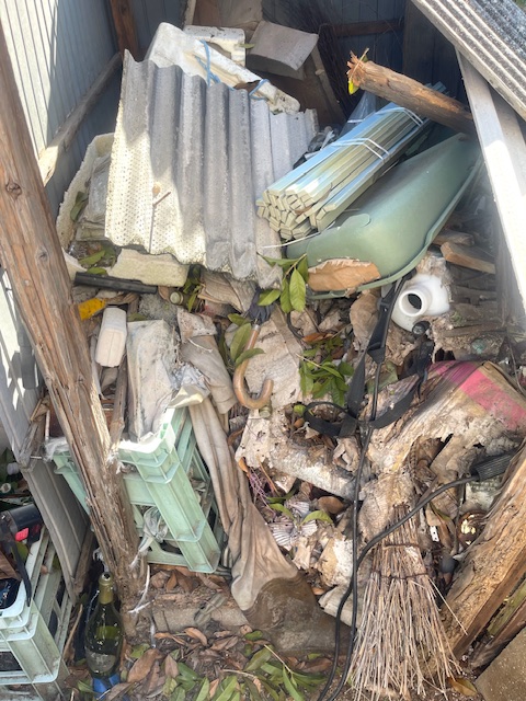 作業:➊現状からのお片づけ➋不用品・劣化物・腐敗物・産廃物・ゴミの回収➌小屋の解体~撤去➍害虫駆除(大量のゴキブリ・ムカデ・クモほか)